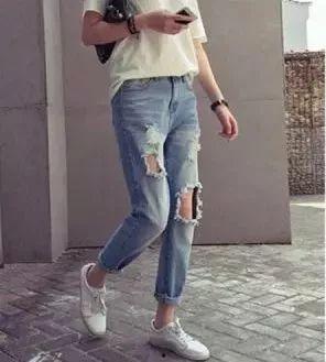 破洞牛仔裤的百搭性也是它受欢迎的原因之一。无论是搭配T恤、卫衣,还是衬衫,都能穿出不同的风格。而且,破洞牛仔裤的款式多样,从高腰到低腰,从紧身到宽松,总有一款适合你。